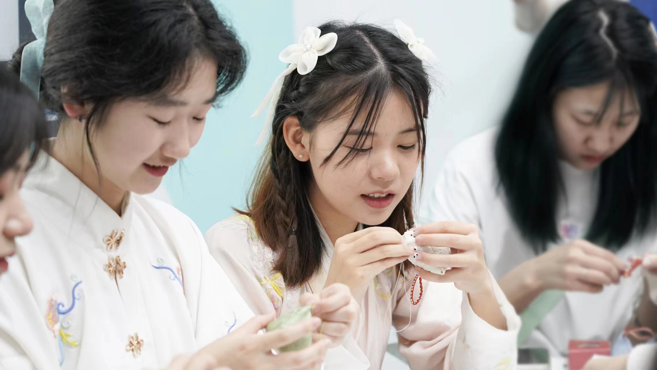 “第一次自己手工制作香囊,锻炼了动手能力,也学到一些端午的文化知识,感觉很有意义也很有意思”,外国语学院2021级本科生王若希讲到,“为了参加今天的活动,我还专门穿了汉服,系上香囊,感觉自己更美了。”