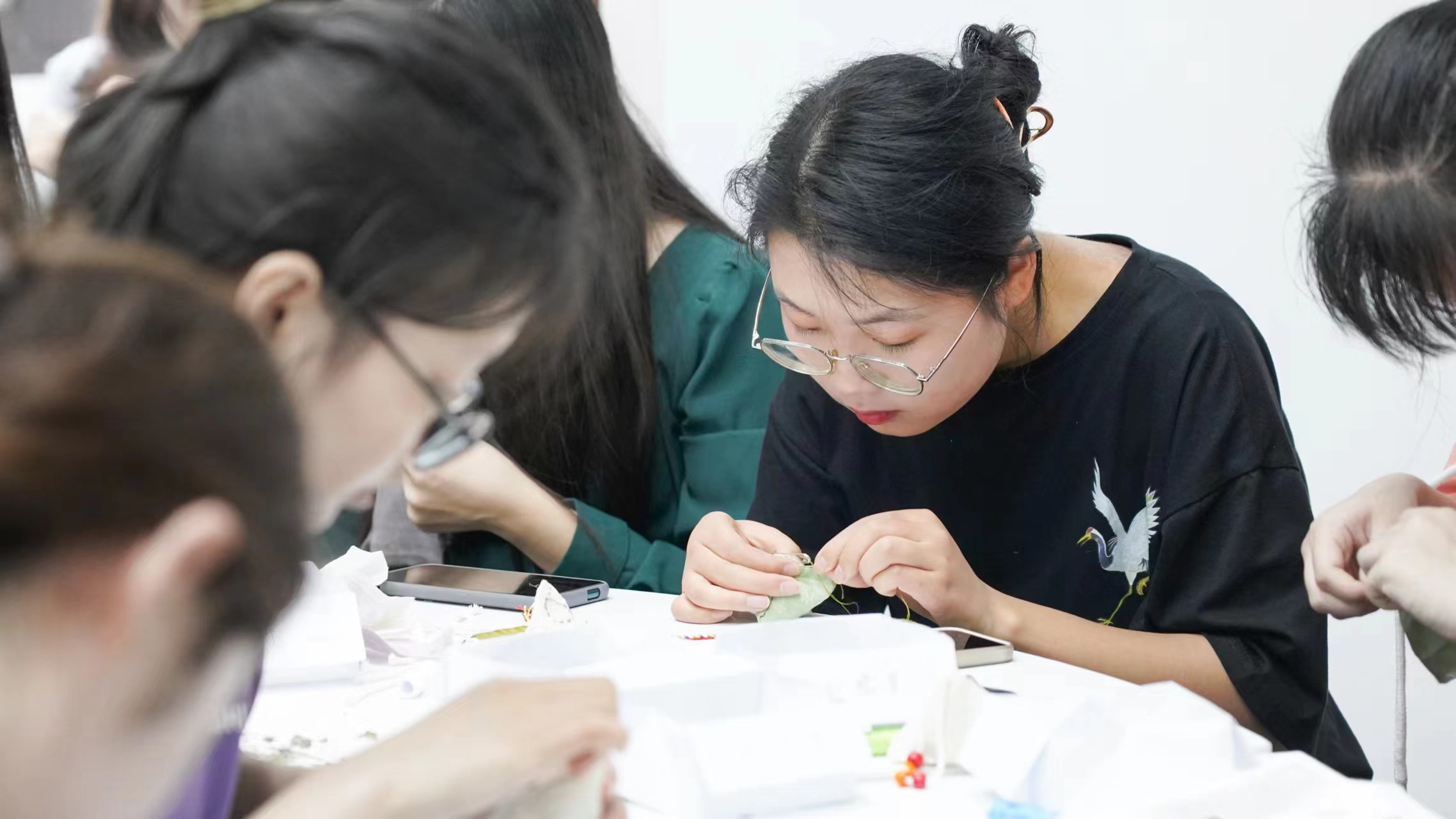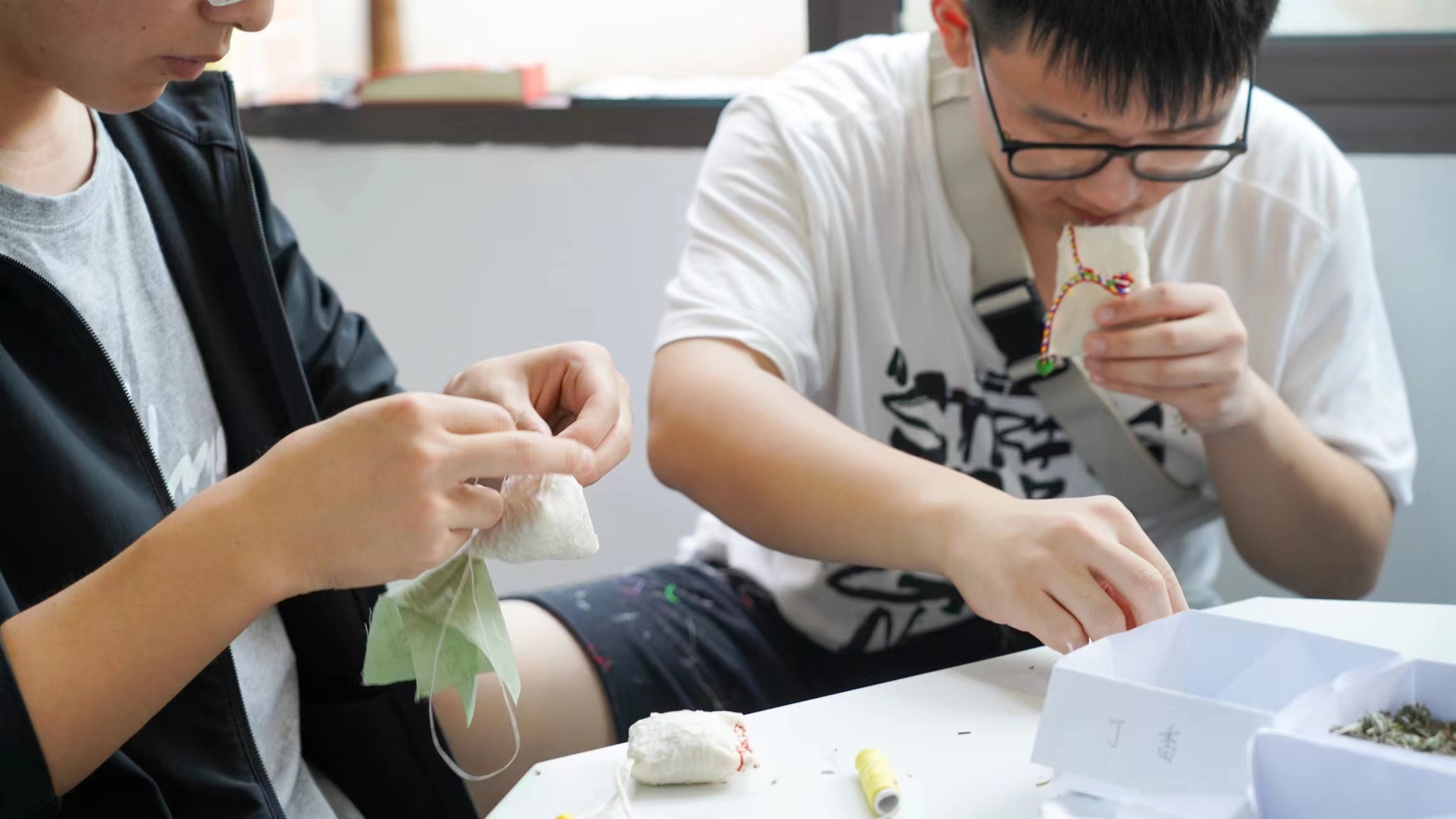 “端午佩香囊,不但有辟邪驱瘟之意,还有襟头点缀之用”,邓越从香囊的作用谈起,依次为同学们介绍香囊的文化背景、制作材料和缝制工序。学校学生园区特设党支部、园区自管会的志愿者也提前为同学们准备了布料、丝线以及艾草、白芷、丁香等香料。同学们在教学嘉宾的现场指导下,纷纷选择自己喜欢的丝线、布料和香料,通过剪料、缝布、装材、封口等工序,陆续制作出一个个小巧精致的香囊,现场欢声笑语、馨香盈盈。