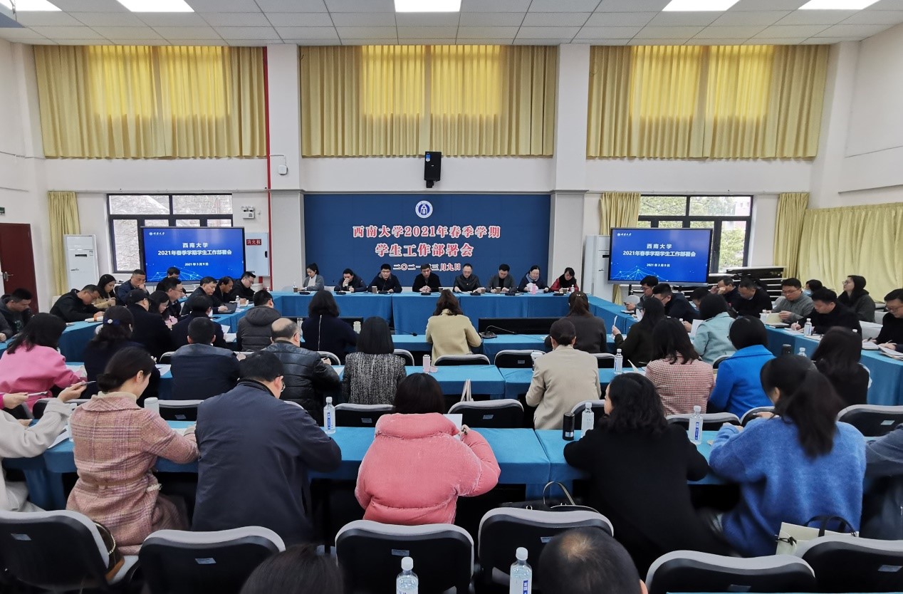 3月9日下午,学校2021年春季学期学生工作部署会在第二学生活动中心420会议室召开。校党委副书记潘洵出席会议并讲话。学校学生工作职能部门负责人、各培养单位党委副书记参加会议。
