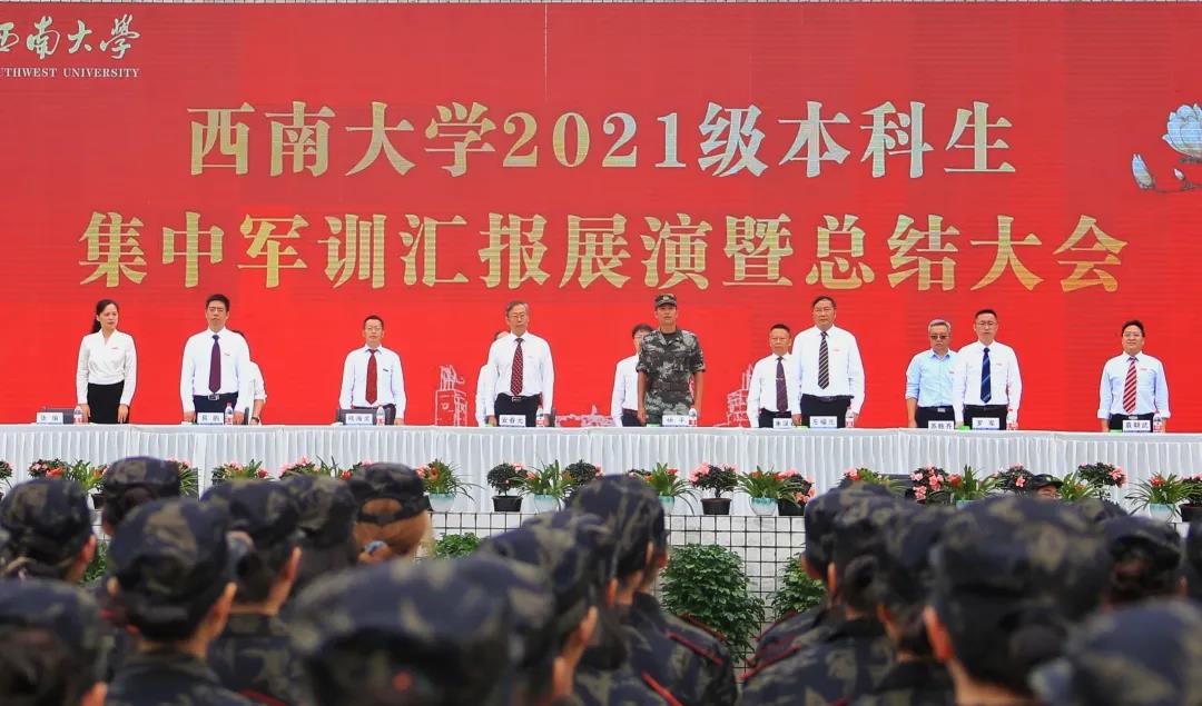 拳拳报国志,沙场秋点兵。9月27日上午,学校2021级本科生军训汇报展演暨总结大会在北碚校区第一运动场和荣昌校区运动场同步举行。校长、军训领导小组组长、军训师师长张卫国,学校党委副书记安春元,学校党委副书记、军训领导小组副组长、军训师副政委潘洵出席活动,军训领导小组成员单位,承训部队全体教导员、各学院(部)参训干部,2021级全体本科生参加。