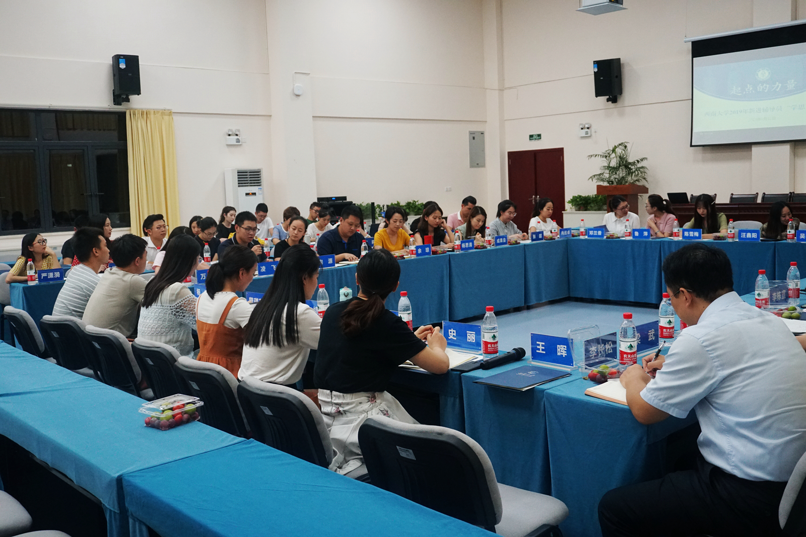 沙龙活动共分为四个环节,首先,21位新进辅导员依次作了发言,对进入PA视讯集团、走上辅导员工作岗位的体会做了分享,纷纷表示面对角色转变,会努力把辅导员这份事业干好,真正为学生的成长成才做出贡献。 接着,两位在职辅导员代表作了工作经验分享,来自政治与公共管理学院的辅导员李长松表示,做辅导员就要坚守本心、富有情怀、主动担当,做到育人和育才相统一。来自文化与社会发展学院的辅导员王晖认为,带学生是一件很幸福的事情,既是看着学生成长的过程,也是自己逐渐成长的过程,要做一个爱学习、有温度、有定力的辅导员。
