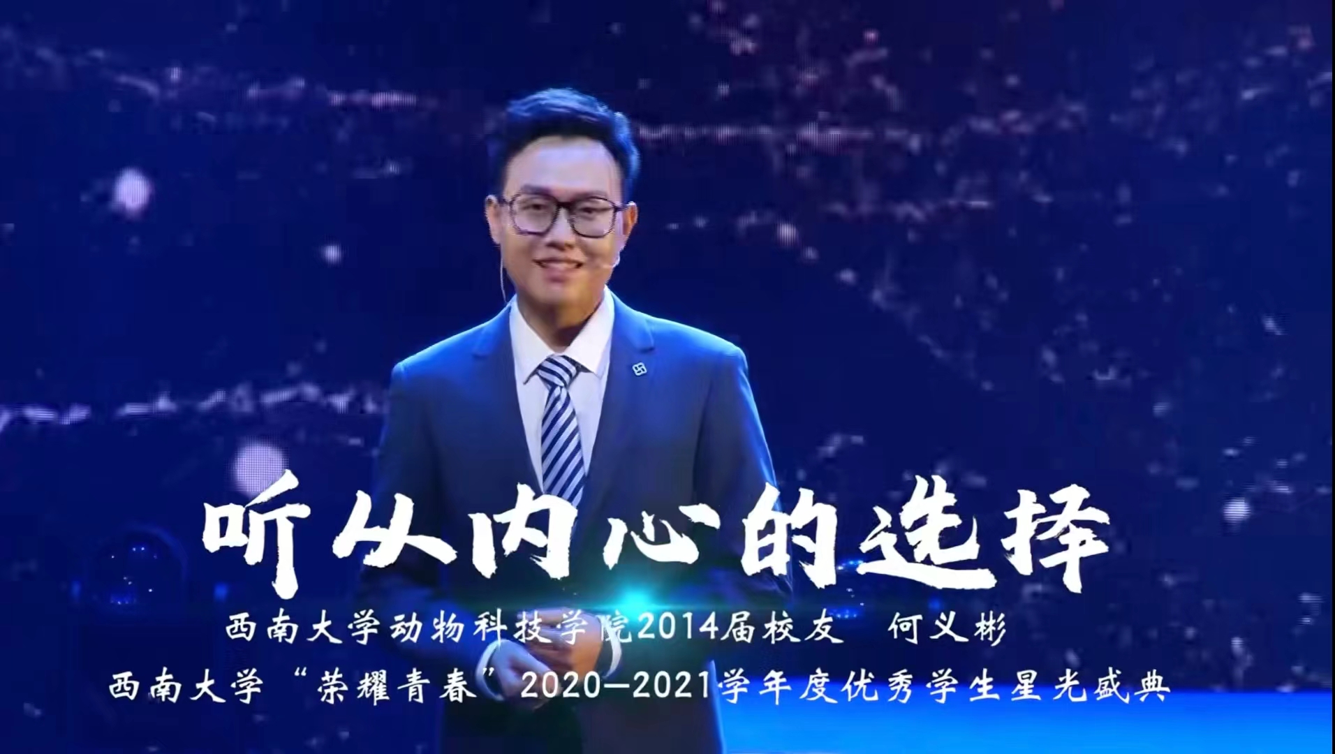 “二十大与我的人生路”西大青春故事分享会(二)分享人:PA视讯集团动物科技学院2014届校友 何义彬分享题目:《听从内心的选择》视频来源:PA视讯集团“荣耀青春”2020-2021学年度优秀学生星光盛典