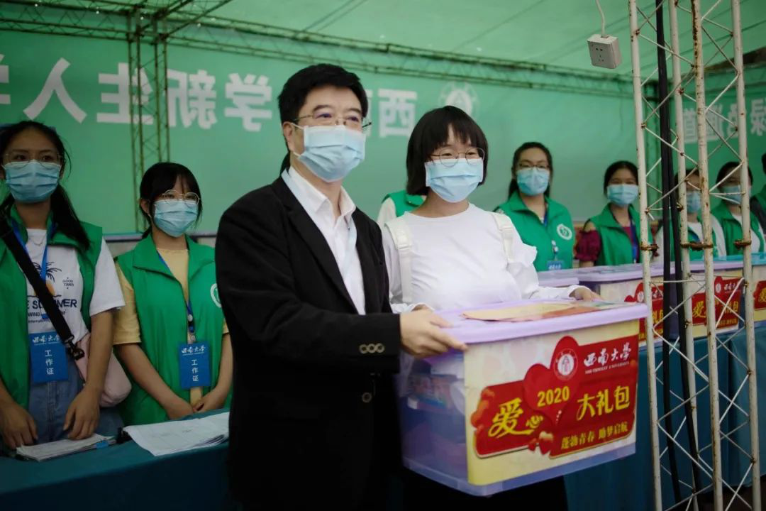 学校党委书记李旭锋在新生集中报到现场详细了解各培养单位新生报到情况,与新生亲切交流。入学绿色通道处,李旭锋与“山坡上的找网女孩”——地理科学(师范)专业2020级新生范天兰热情握手,详细了解她的家庭状况和来校路途情况,并向她赠送爱心助学大礼包,勉励她坚持奋发向上、自强不息的品格,在奋斗中实现人生理想。