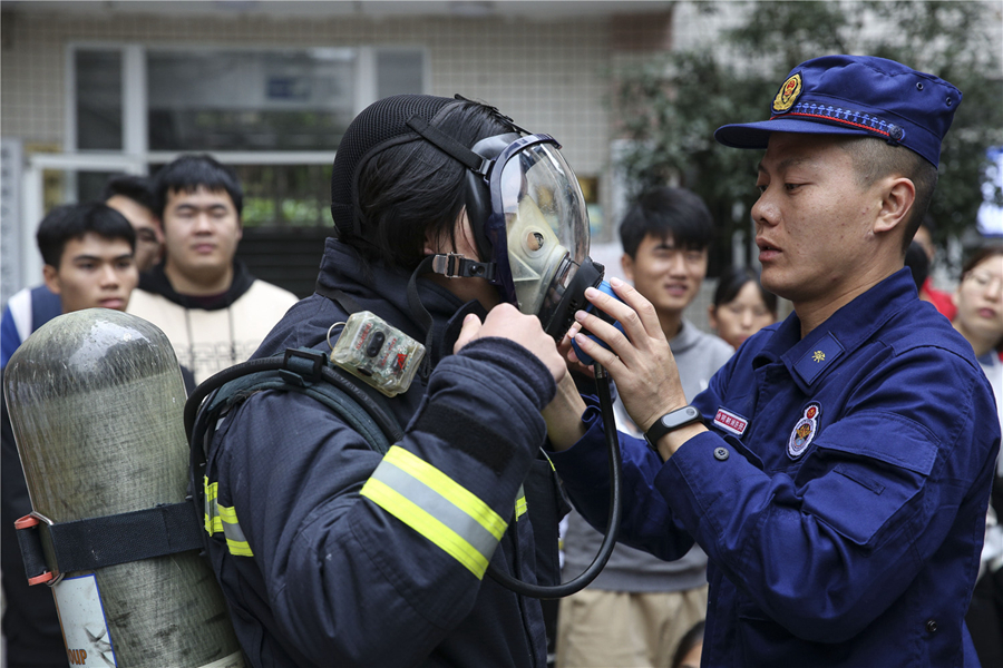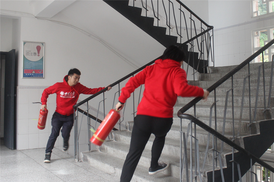 在学生园区文化广场和学生宿舍楼,“爬楼灭火”赛跑、“抢灭火器”拔河比赛、消防装备整理比赛等趣味项目吸引了来自不同学院的同学纷纷参与。“原来拧着灭火器从一楼快速冲到六楼会有这么累,也头一次感受到消防员灭火的辛苦,向消防战士致敬”,来自大一年级的林鸿栩同学这样说道。