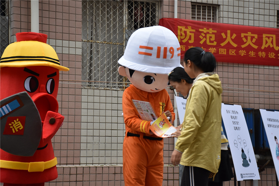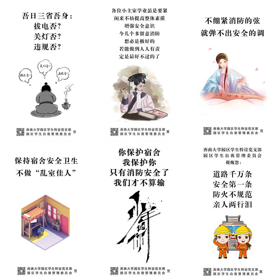 “说消防,道消防,人人都要懂消防……”中午,学生党员示范班组织的快板小分队来到学生食堂,为正在就餐的同学们带来朗朗上口的消防快板秀,引得大家阵阵喝彩。“吾日三省吾身:拔电否?关灯否?违规否?”、“你保护宿舍,我保护你;只有消防安全了,我们才不算输”、“道路千万条,安全第一条,防火不规范,亲人两行泪”……宿舍楼下一张张别出心裁的消防创意海报引来同学们纷纷称赞。在下课途中,园区学生特设党支部的党员同学身着“消防员”“消防栓”“灭火器”的消防人偶,向大家分发消防宣传单,也吸引了同学们纷纷合影。