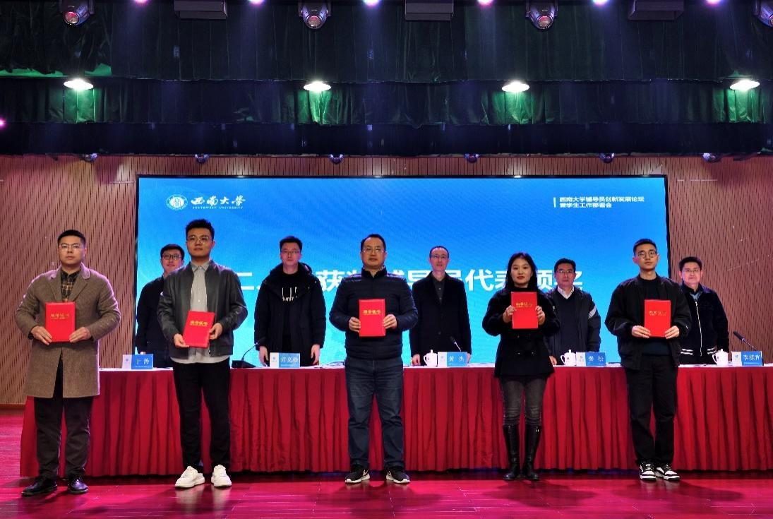 黄杰宣读2023年辅导员素质能力大赛、辅导员创新发展论坛优秀论文和案例获奖者名单,并与职能部门负责人一起为获奖代表颁奖。