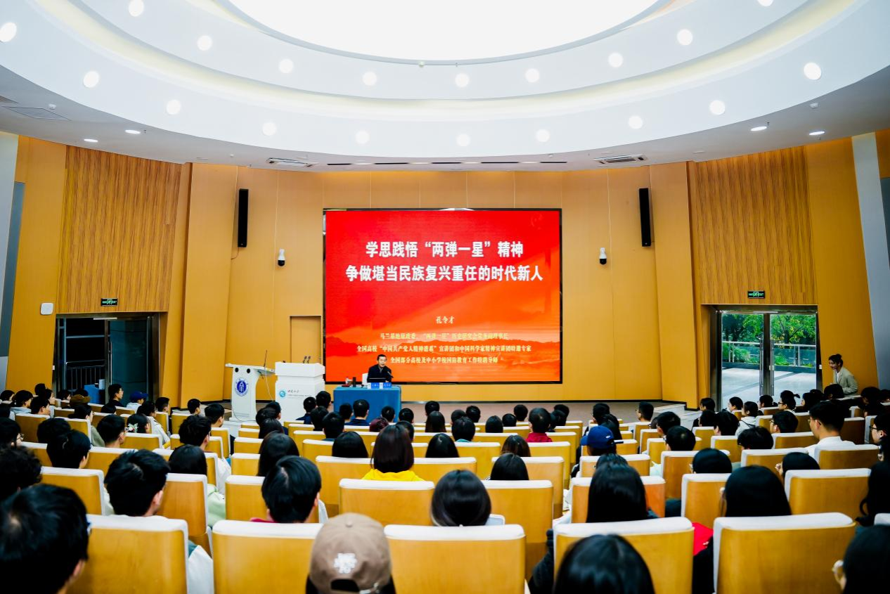 孔令才以真挚动人的讲述和丰富的历史影像,带领师生回顾了“两弹一星”事业的辉煌历程,深刻阐释了“热爱祖国、无私奉献、自力更生、艰苦奋斗、大力协同、勇于登攀”的“两弹一星”精神内涵。他从钱学森、邓稼先、郭永怀等科学家的感人事迹,到林俊德院士生命最后时刻仍坚守岗位的动人片段,再现了那段艰苦卓绝却光辉熠熠的岁月。孔令才鼓励青年学子思考“我们从哪里来,要到哪里去”,牢记嘱托,内化于心,外化于行,树立“强国有我”的志向,勤学笃行、追求卓越,努力成为堪当民族复兴重任的时代新人,奋力书写为中国式现代化挺膺担当的青春篇章。