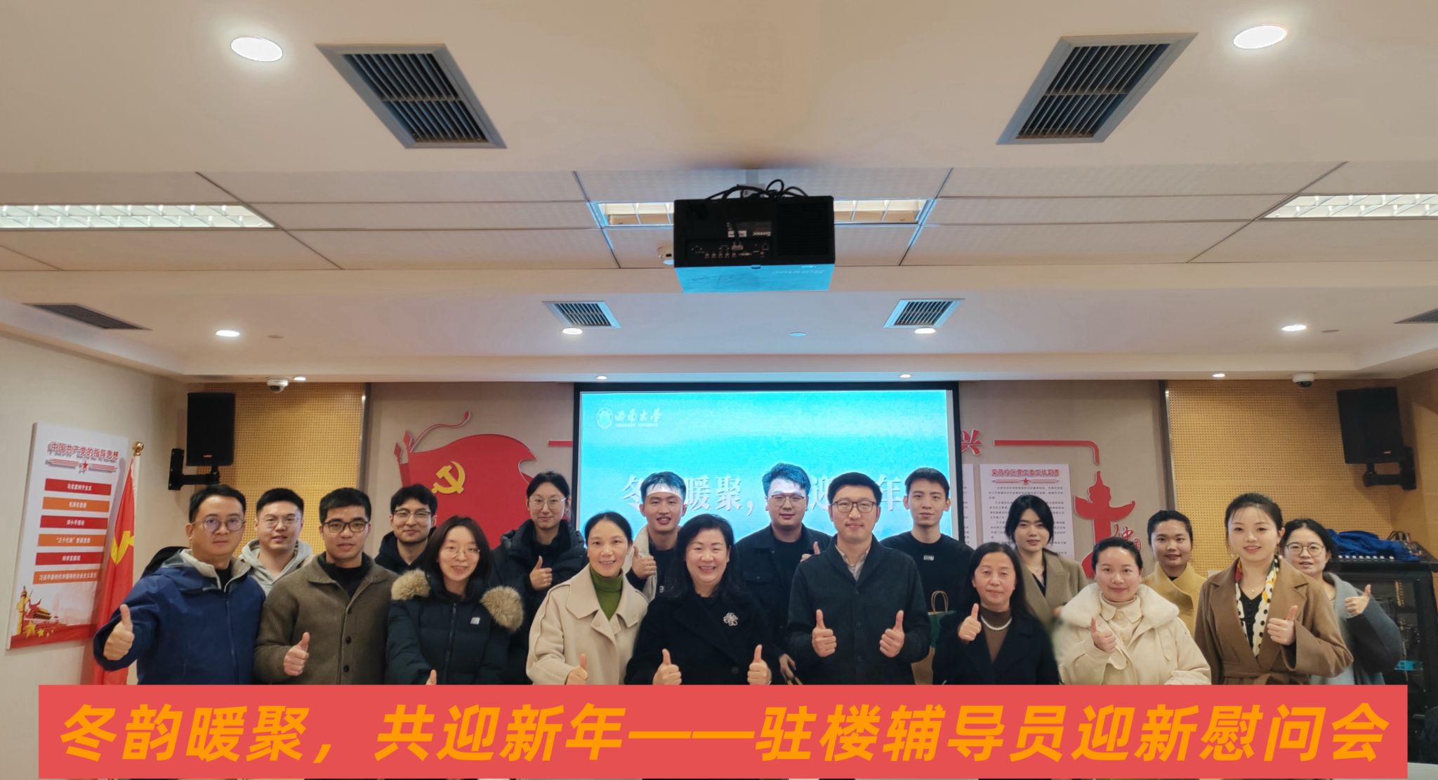 12月30日,党委学生工作部在荣昌校区召开驻楼辅导员迎新慰问会。校团委书记,党委学生工作部、学生工作处、武装部副部长(兼)于涛,党委学生工作部副部长、学生工作处副处长、园区育人服务中心主任(兼)周敏,党委学生工作部副部长、学生工作处副处长、荣昌校区学生工作办公室主任(兼)罗艳芬出席会议,各学生社区驻楼辅导员及相关工作人员参加会议。会议由周敏主持。