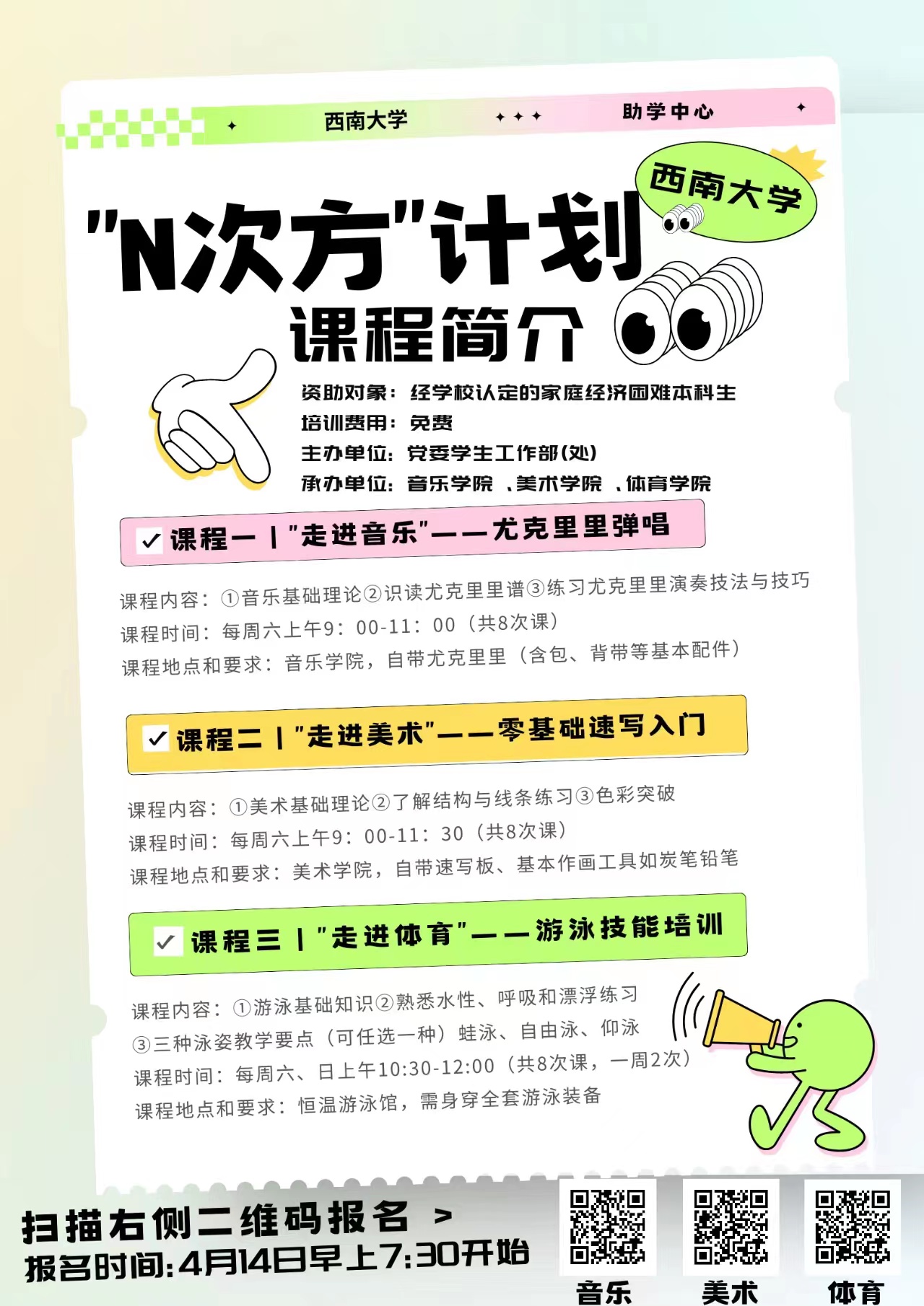 3.因资源有限,助学中心将结合困难情况、成绩、志愿时长、参加公益活动、报名顺序等综合确定录取名单并短信通知学员,报名将在4月14日早上7:30开始,请学生扫描活动宣传海报二维码填写报名信息,报名完成后及时进入QQ群(音乐:343341784、美术:215792922、体育:291344920)。未能参与到本期课程的同学敬请关注下一期培训。