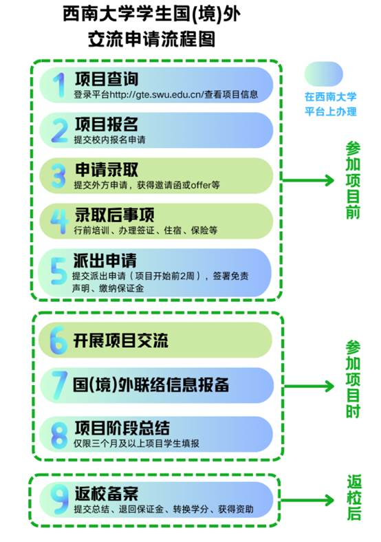 1. 根据如下图示完成项目申请、派出、返校等流程。(提交报名表后,请关注申请流转记录(平台-个人中心):