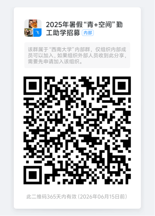3.工作时间:2025年7月7日-2025年8月31日,原则上青李空间、青竹空间、青樟空间均需每天排1班(21:30-22:30),每班保证至少1人在岗。