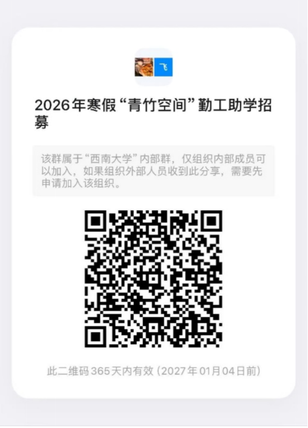 青竹空间是广大同学在学生社区学习生活和互助成长的共享空间、“一站式”学生社区育人的重要阵地,内部建有生活服务坊、研习沙龙室等功能厅室。为保障青竹空间在本学期末和2026年寒假正常运行,现面向在校学生招募值班管理人员若干。