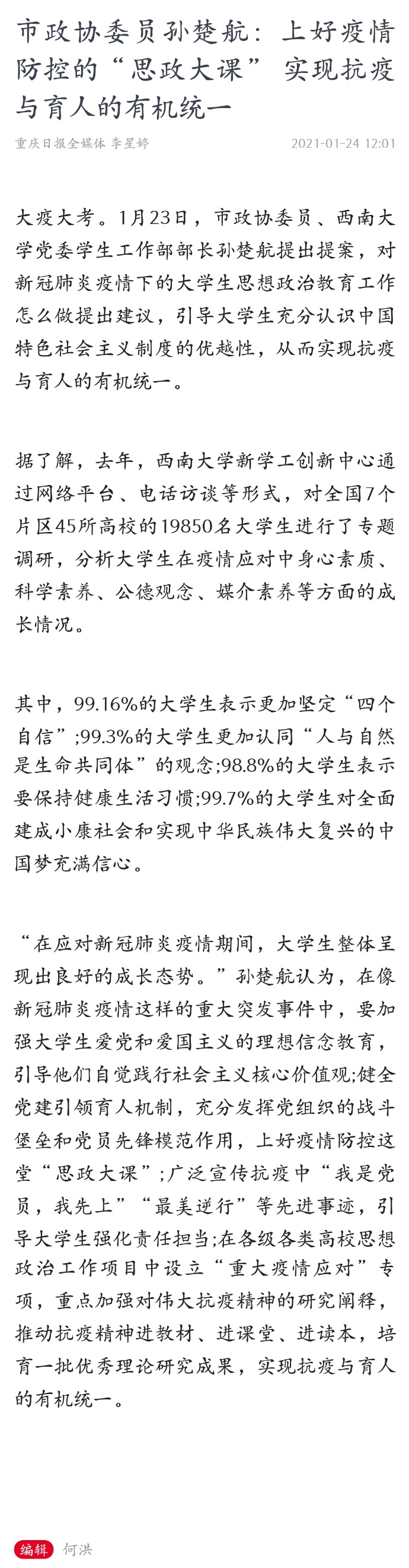 市政协委员孙楚航:上好疫情防控的“思政大课” 实现抗疫与育人的有机统一