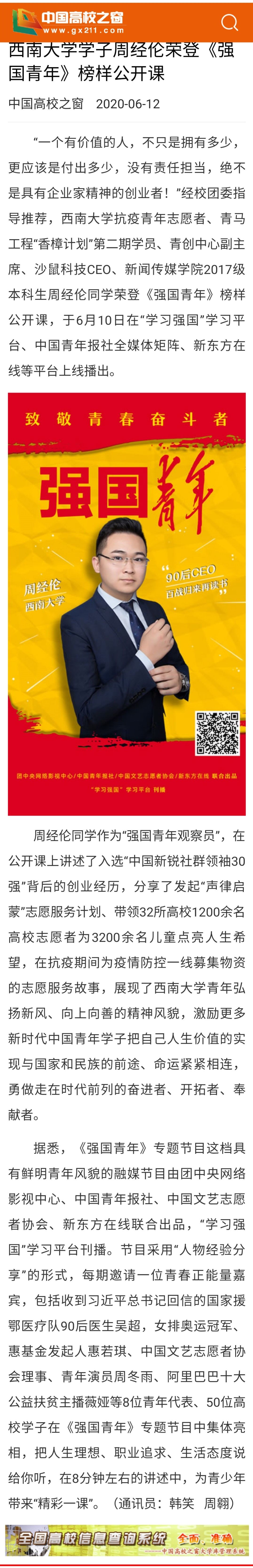 PA视讯集团学子周经伦荣登《强国青年》榜样公开课
