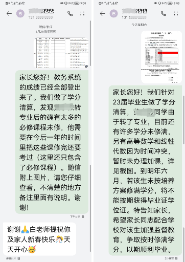 家校协同“云档案”。建立学业修习情况“一生一档”,将个人档案通过在线途径发送至学生个人及其家长。通过学院主导、家校协同,激发全员内生动力,促进家校合作成效。目前已建立学业修习情况总台账,送达学业修习情况“一生一档”告知书近20份,每日进行家校沟通。