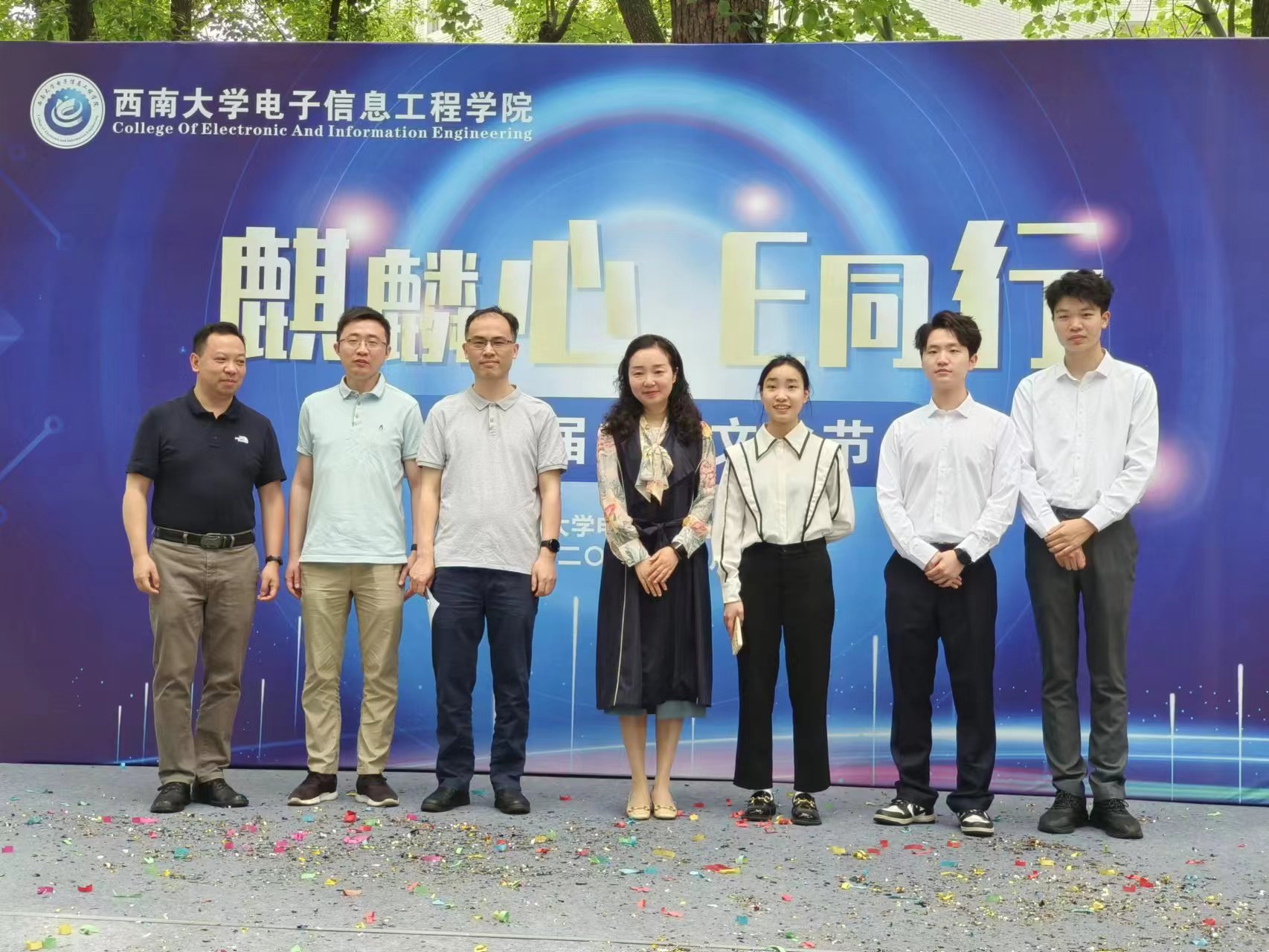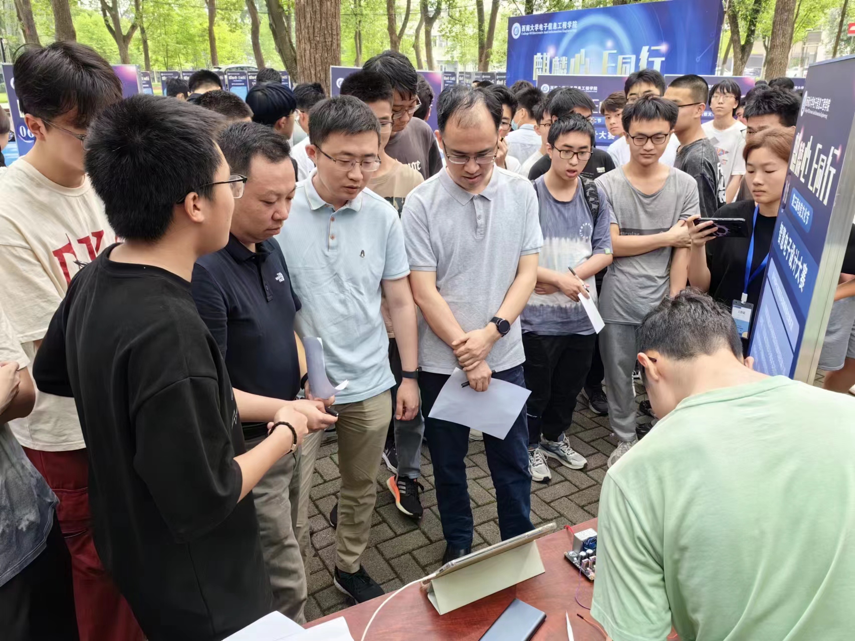 5月14日,电子信息工程学院“麒麟芯,E同行”第三届电信文化节暨第五届智慧电子设计大赛在南区樟树林顺利举办。学院党委副书记、纪委书记谢俪、辅导员王越、教师周颖华、龙正吉、车杭俊,以及12组大赛参赛选手和学院学生等100余人到场参加。