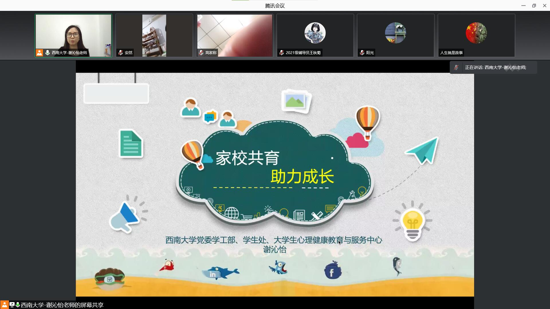 5月25日晚,外国语学院“5·25”心理健康节系列活动首期专题讲座顺利举行。活动作为“云”家长学校系列课程之一,邀请国家二级心理咨询师、学校大学生心理健康教育与服务中心主任、重庆市青少年性健康教育研究会理事谢沁怡老师以《家校共育·助力成长》为主题进行专题分享,近200位家长线上参与活动,活动由学院党委副书记李晓畅主持。