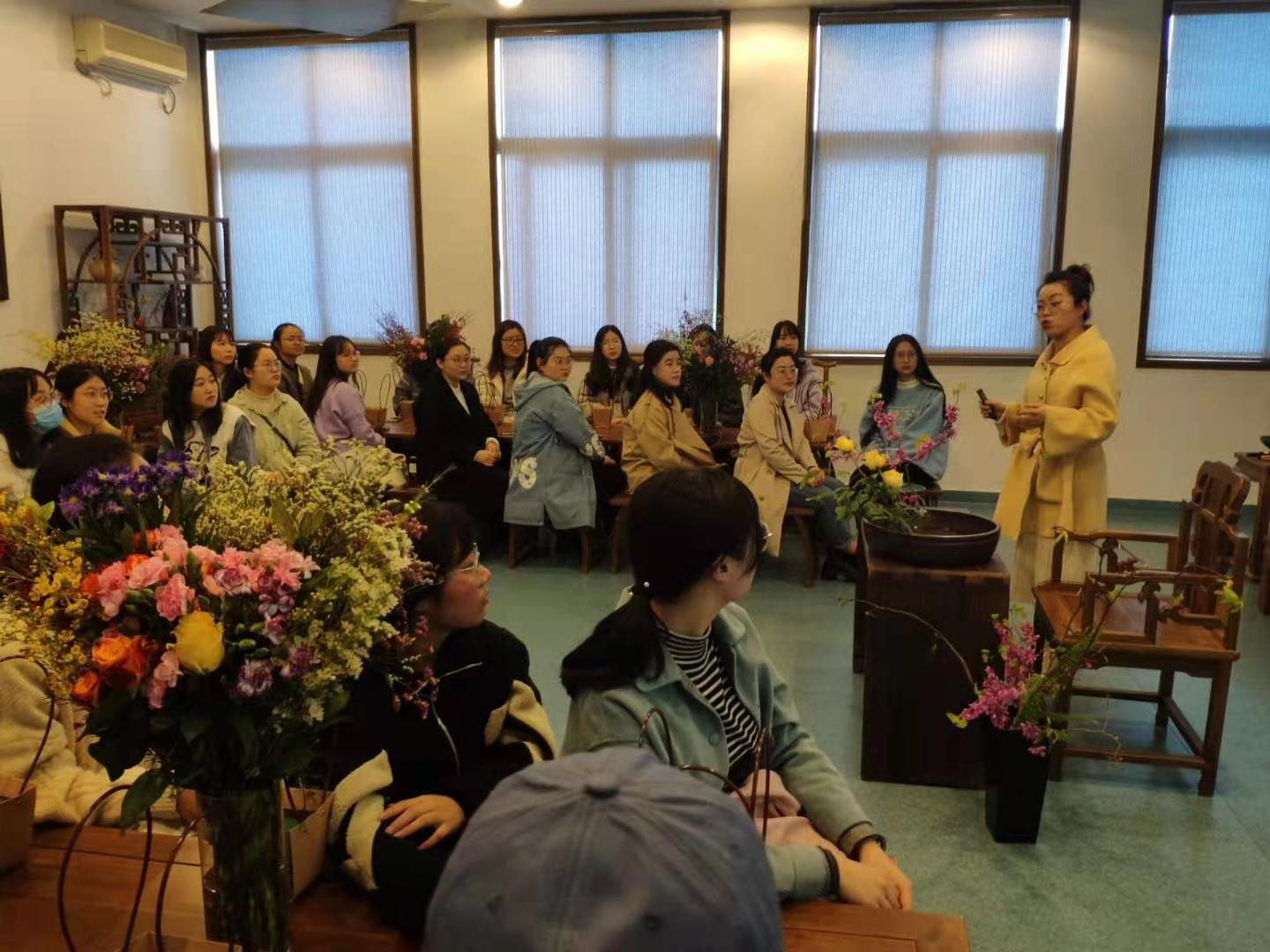 介绍完中国传统插花文化,汪林老师又向同学们讲述了世界插花艺术流派与风格。她首先就广义和狭义两个角度阐述了插花的定义,随后她介绍了西方式插花的独有特点——以几何美学为基础,重视色彩及外观轮廓的变化。强调装饰性,强调人的主观创作。她举例介绍了欧洲古典花艺、美式花艺、新欧式花艺与自然风格花艺。随后对中西方插花艺术进行了横向对比——相较于西方式插花,东方式插花师法自然,花材比较简练,不以量取胜,而以姿态、线条取胜,不仅着力表现花朵的美,而且十分重视枝、叶和果实的表现力及季节的感受。汪林老师深入浅出的讲解极大地激发了同学们的学习兴趣,使同学们对插花艺术有了更深刻的理解。