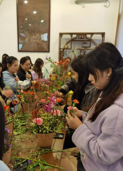汪林老师还为同学们讲解了花卉识别与养护技巧,随后带领同学们进行了插花艺术的实操体验。她向同学们展示了中式插花的技术手法与提篮花的插花技巧,强调了水分在保持提篮花美感的重要作用,并对同学们的实操过程进行了详细指导。同学们在实操过程中仔细甄别花材,系统运用学到的知识,最终制成了各具特色的插花作品。
