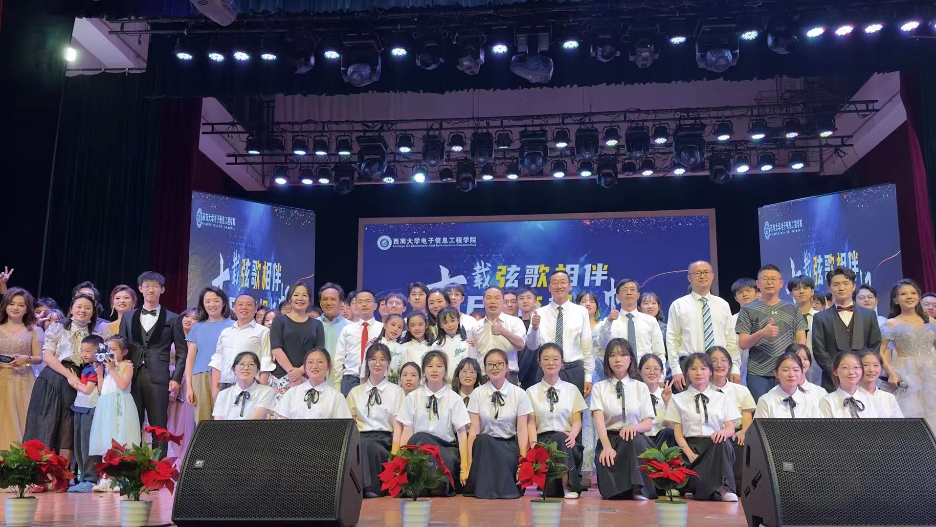 5月20日,电子信息工程学院“十载弦歌相伴 E路奋楫扬帆”十周年院庆暨2023届毕业晚会在光大礼堂成功举办。学院党委书记熊海灵、院长李传东、原党委书记毕均明、党委副书记、纪委书记谢俪、副院长解宜原、李华青、办公室主任高渤、信息安全系主任王慧维、实验中心主任刘东卓、学工办主任张颜、教学办公室主任何沐曦、2019级辅导员余琼以及学院师生等800余人观看晚会。