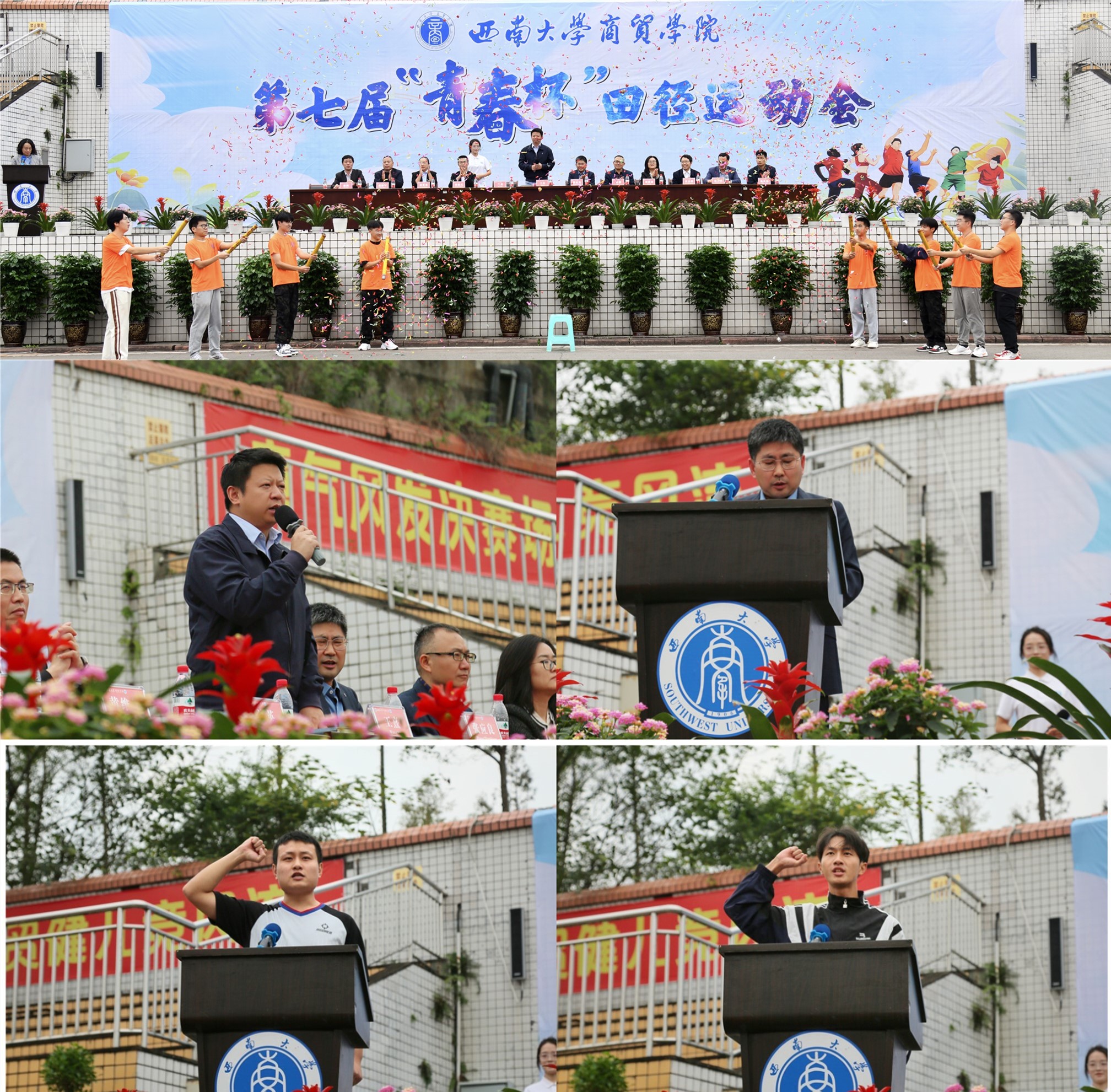 10日下午,运动会开幕式在田径运动场举行。学院全体党政领导及在校师生参加开幕式。开幕式由学院党委副书记、纪委书记兰英主持。学院院长张应良在开幕式上致辞。他表示,商贸学院作为学校“三全育人”试点单位,坚持以“五大人才培养计划”为依托,充分利用体育赛事的育人价值,不断切实发挥体育对人才培养体系的筑基作用。建院以来,学院体育工作成果丰硕,在各级各类赛事中成绩突出。希望全体师生共同努力,把“青春杯”田径运动会办成一个“团结、拼搏、积极、进取”的盛会。随后,裁判员代表王岩和运动员代表许轩玮分别宣誓。学院党委书记王熹宣布运动会正式开幕。礼炮轰鸣,运动场上彩旗飘扬,运动健儿们的比拼正式开始。