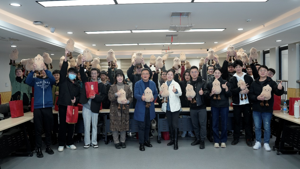 交流结束后,学院领导、老师向考研学生赠送“考研加油包”。花生玩偶寓意“好事发生”,旺仔牛奶寓意万事兴旺,文具套装为学子们提供便利与支持,饱含学院的深切关爱与殷切期望。同学们高举玩偶,共同留下了珍贵的合影。
