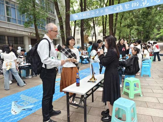 2025年5月9日,音乐学院举办“音美润心,乐游集趣”音乐文化游园之旅——美育角系列活动。活动将音乐美育延伸至校园户外空间,通过“音乐+通感体验”的形式,面向全校师生开展中西乐器展示、音乐文化科普、音乐舞蹈视听鉴赏、乐器互动体验教学、音乐心理沙龙等,搭建可听、可视、可触的音乐通感户外课堂,带领师生在游园过程中沉浸式体验音乐文化,感受音乐带来的美好。
