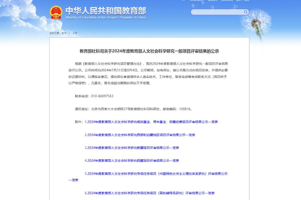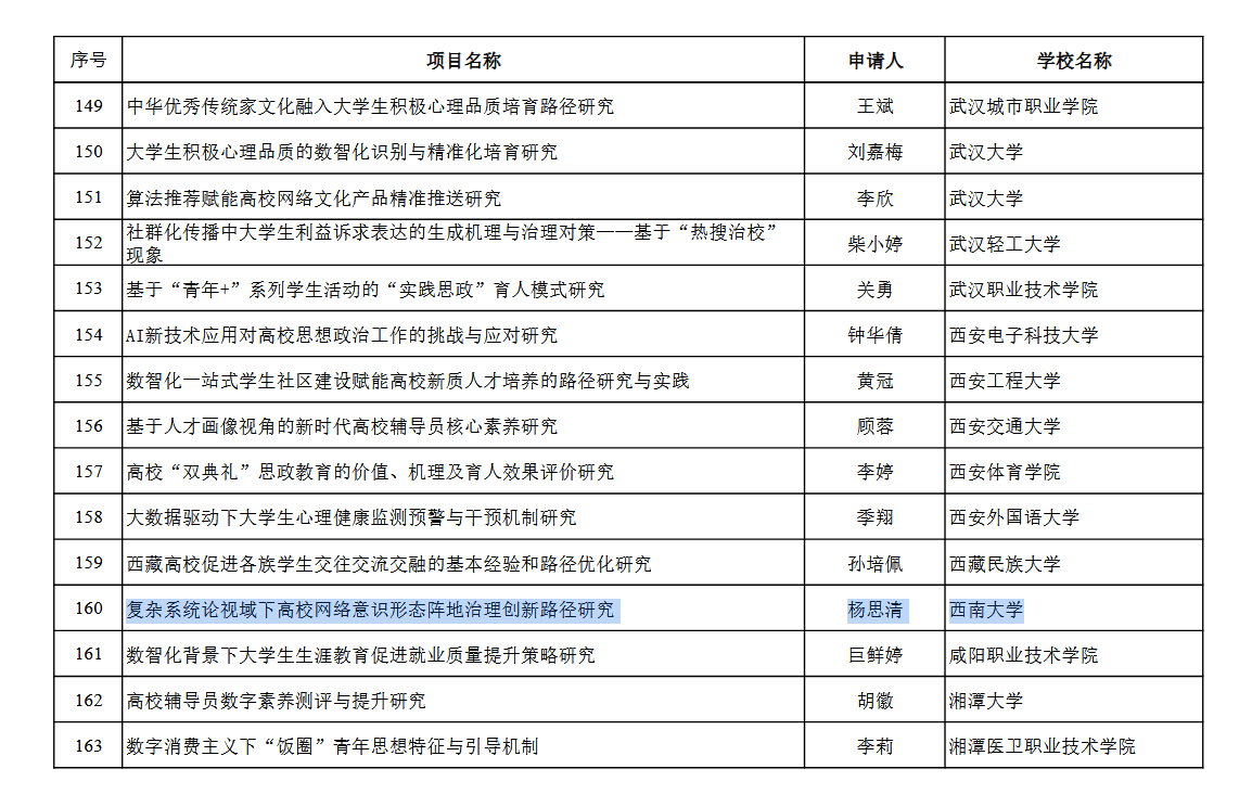 7月31日,教育部公示了“2024年度教育部人文社会科学研究一般项目”评审结果。学校化学化工学院辅导员杨思清主持的项目《复杂系统论视域下高校网络意识形态阵地治理创新路径研究》入选专项任务项目(高校辅导员研究)。这是近三年来学校首次入选该类项目。