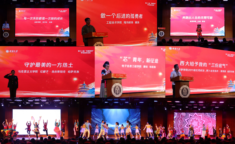 在主题分享环节,体育学院张天佑(白族)、工程技术学院嘎玛顿珠(藏族)、商贸学院梁洁(壮族)、马克思主义学院红都子·热衣斯别克(哈萨克族)、电子信息工程学院康媞(布依族)五位同学,以及地理科学学院2015届优秀校友,新疆喀什第三中学德育处主任兼团委书记阿卜杜可热木·麦麦提(维吾尔族),分别以《每一次失败都是一次新的成长》《做一个后进的孤勇者》《奔跑出人生的无限可能》《守护最美的一方热土》《“芯”青年,新征途》《西大给予我的三份底气》为题,分享自己在家国情怀、突破进取、优秀传承等方面的优秀事迹,鼓励各民族学生在成长路上勇毅前行、团结奉献,以青春奋斗之姿,筑青春中国之盛。