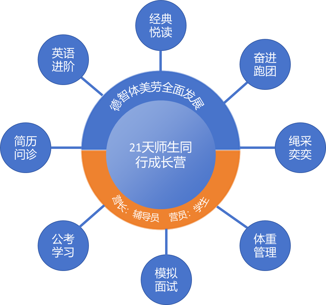 基于马克思主义“真正共同体”的实践要求,学院构建了“目标共定—场域共建—项目共研—发展共评”的四维运行逻辑,推动师生从物理聚集走向化学融合,实现共同体从形式建构到实质生效。围绕思想理论教育和价值引领、学风建设、职业规划与就业创业指导等辅导员工作职责和“五育融合”育人要求,结合学生当前发展中的需求与痛点,师生共同开设了经典悦读、英语进阶、简历问诊、模拟面试、公考学习、体重管理、奋进跑团、绳采奕奕八个营,辅导员根据教育背景、擅长领域和所带年级担任营长,全程陪伴,同步打卡,同时整合校友、专任教师、朋辈等育人合力,既为学生思想政治素质、科学文化素质、身心健康素质的全面发展提供精准服务,又充分激发学生自我教育、自我管理、自我服务、自我发展的内生动力,实现思想政治教育与青年日常的“无缝衔接”。